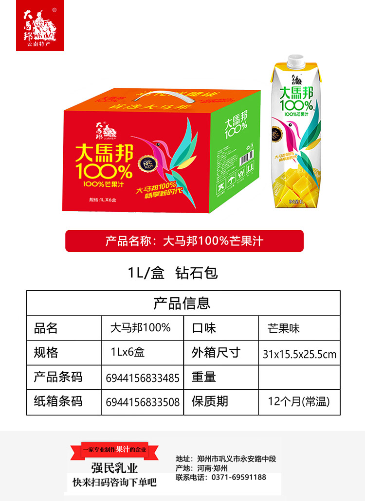 這款芒果汁飲料也是采用云南原產(chǎn)地新鮮芒果??,濃縮冷榨罐裝工藝,很大程度保留了原色原香原果的原味。果香濃郁,配料表只有純凈水、濃縮芒果汁、芒果原漿,每一瓶含有豐富的維C,是您健康生活,休閑娛樂,健身運動的好伴侶。
